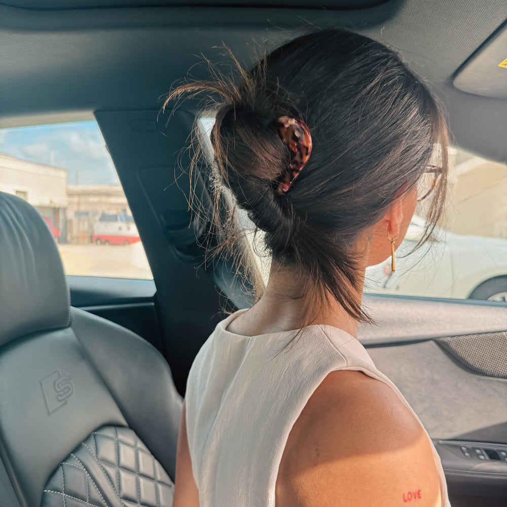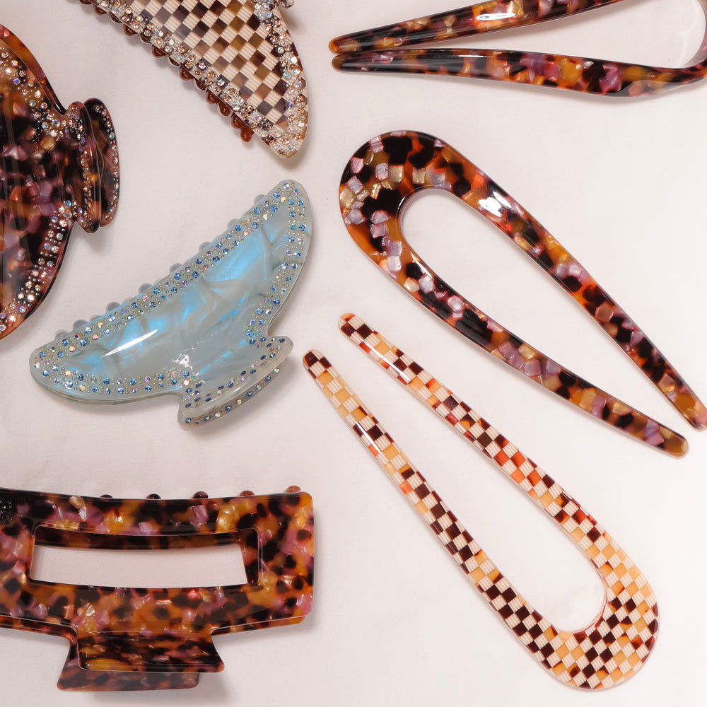 Made from premium acetate, our French Hair Pin offers both style and durability. Its flexible design resists breakage and glides smoothly through hair without snagging. Plus, acetate is biodegradable. Whether securing a twist or a half-up style, this pin adds the perfect finishing touch in any of our 3 versatile shades.