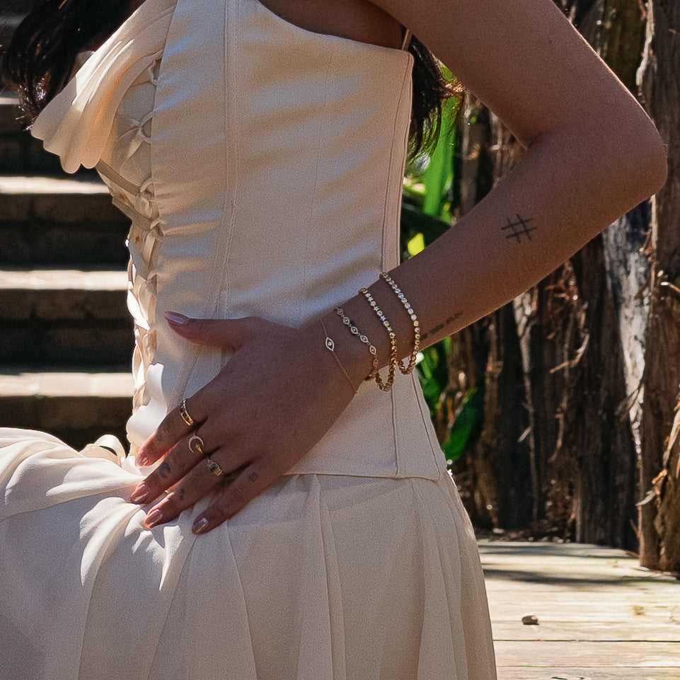 A celestial touch, the Halo Bracelet encircles each stone in a sleek bezel setting, creating a luminous “halo” effect, set like orbiting stars.