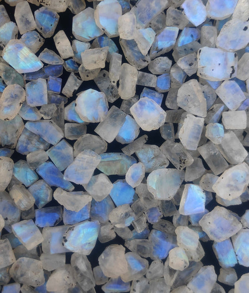 Belonging to the feldspar mineral family, Moonstone exhibits opalescent qualities and is available in various colors such as colorless, peach, pink, green, gray, yellow, brown, and blue. The captivating play of light observed in Moonstone is referred to as adularescence, with its transparency ranging from transparent to opaque. The most highly esteemed Moonstones hail from Sri Lanka and India, with blue variants being particularly prized for their rarity, exclusively found in Sri Lanka. India is renowned for its production of Rainbow Moonstones.